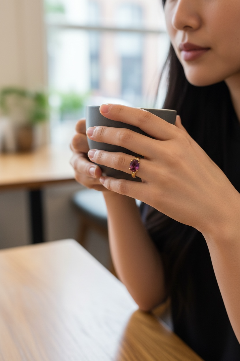 深みのある赤紫色に輝く石、脇には6石のメレダイヤを添えた、落ちついた気品と
